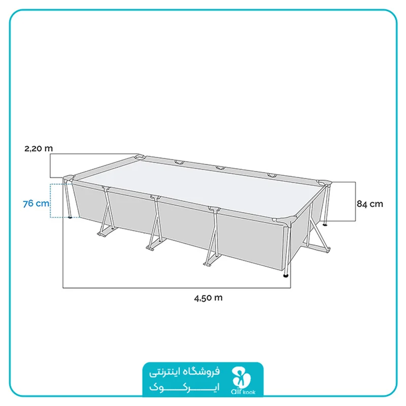 ابعاد این محصول 4.5 متر × 2.2 متر × 0.84 متر است و برای شنای دسته جمعی جای هیچ نگرانی نیست. وزن کلی این محصول 39.2 کیلوگرم است و حدود 7127 لیتر ظرفیت دارد. بدنه مقاوم این استخر (PVC) در برابر ضربه و سوراخ شدن بسیار مقاوم است و میتواند حس خوب شنا را به صورت آزادانه برای شما فراهم کند. همچنین فریم استخر 28273 از نوع فولاد ضد زنگ و ضد آب است. برای نصب این استخر به هیچ دانش خاصی احتیاج ندارید و به سادگی میتوانید آن را تنها در 30 دقیقه بر پا کنید و لذت ببرید.