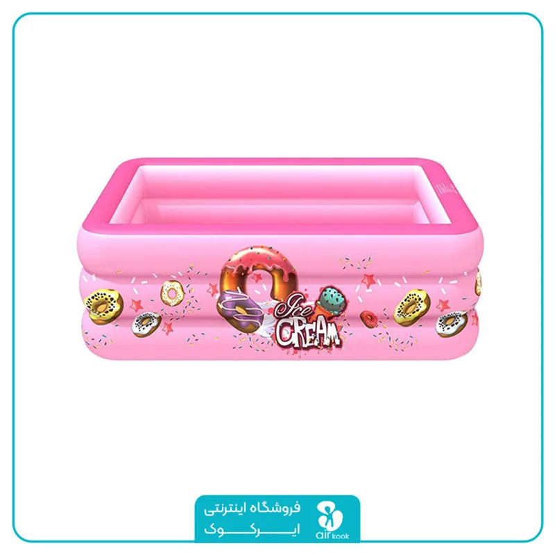 استخر بادی طرح دونات دارای طول 1.80 و عرض 1.35 متر میباشد. از ویژگیهای بارز ابعادی این محصول استفاده از آن به عنوان وان در حمام است. کف بادشو این محصول حس راحتی را در هنگام آب تنی به کودک منتقل میکند. ارتفاع آن 55 سانت است که باعث میشود شما بتوانید علاوه بر استفاده به عنوان استخر و وان، آن را با توپ برای تفریحات کودکان پر کنید. کف این استخر دریچه تخلیه ندارد بنابراین توجه داشته باشید که هنگام تخلیه آن به یک باره استخر را بلند نکنید. بلکه به لبه بدنه آن با دست فشار وارد کنید تا آب کم کم خالی شود.
