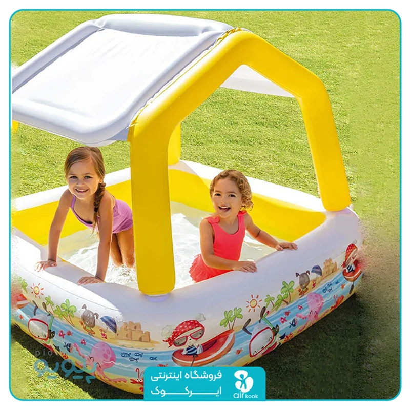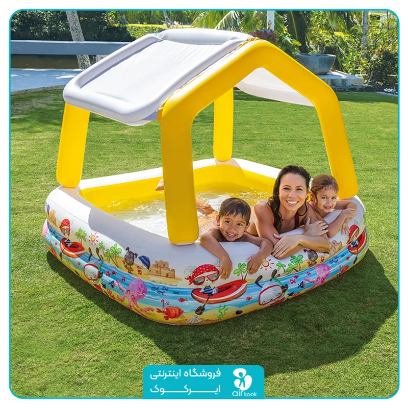 استخر بادی سایبان دار کد 57470 توسط شرکت اینتکس با ترکیب رنگ جذاب روانه بازار شده است. استخر بادی به شکل مربع ساخته شده و دارای سایبان می باشد. وجود سایبان به شما این امکان را میدهد تا بدون اینکه پوست کودک دلبند شما در آفتاب آسیب ببیند، در محیط حیاط و باغ مورد استفاده قرار گرفته و فرزند شما به تفریح و آب بازی بپردازد. اینگونه استخر زیبا و کاربردی می تواند مورد نیاز هر کودکی قرار گیرد.