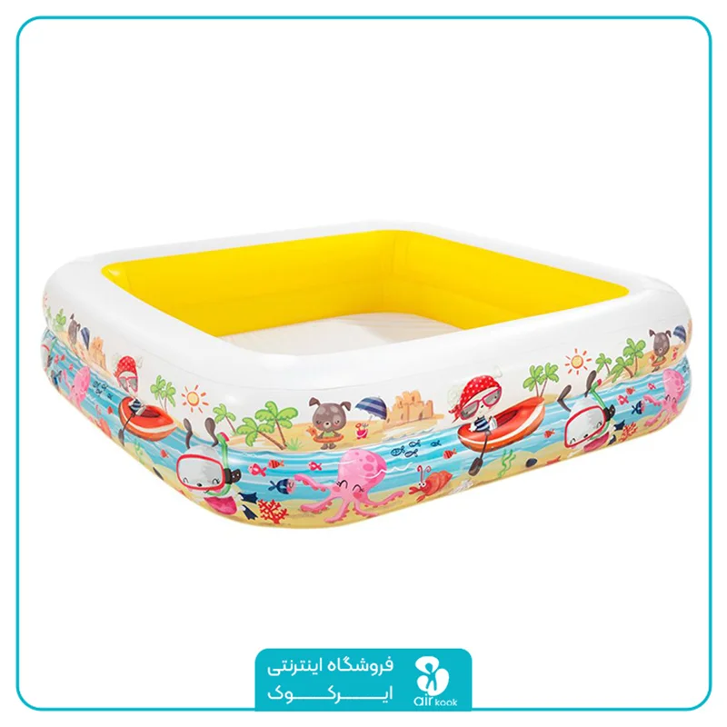 روی بدنه محصول تصاویر فانتزی شخصیت های کارتونی و موجودات دریایی مشاهده می شود و دیواره داخلی زرد رنگ آن برای کودکان جلب توجه می نماید. کف استخر به رنگ سفید و ساده طراحی شده و همچنین دارای یک دریچه جهت تخلیه آب می باشد. کودک شما میتواند در این استخر به عنوان استخر توپ هم به تفریح بپردازد.